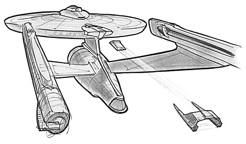 The script called for a long-range shuttlecraft to carry Spock from Vulcan to rendezvous with the Enterprise. Roddenberry specified that the shuttle should have large nacelles so that it was believable that it could catch up with the Enterprise. Probert began sketching designs with nacelles that resembled those on the TOS Enterprise.