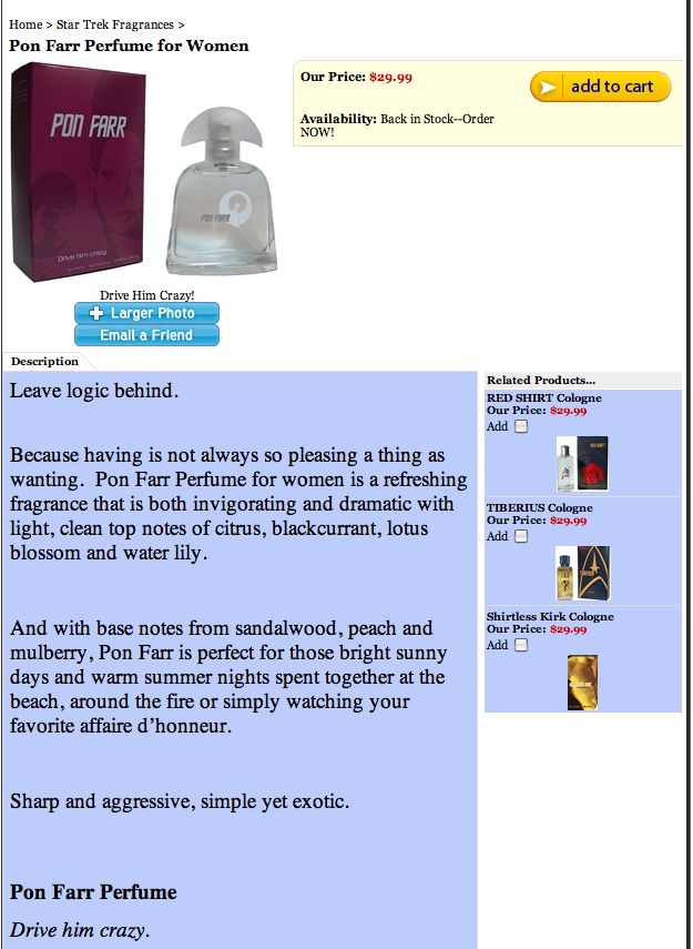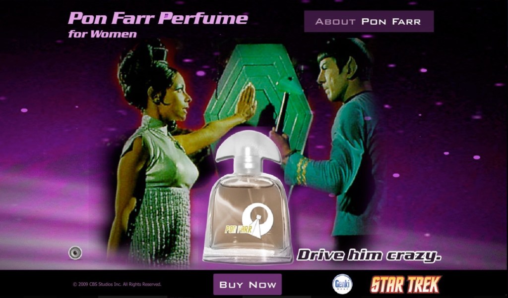 Pon Farr is, of course, the Vulcan time of mating. Genki has created a pretty clever marketing campaign for this fragrance featuring images from the seminal TOS episode “Amok Time” and taglines like “Drive Him Crazy.”