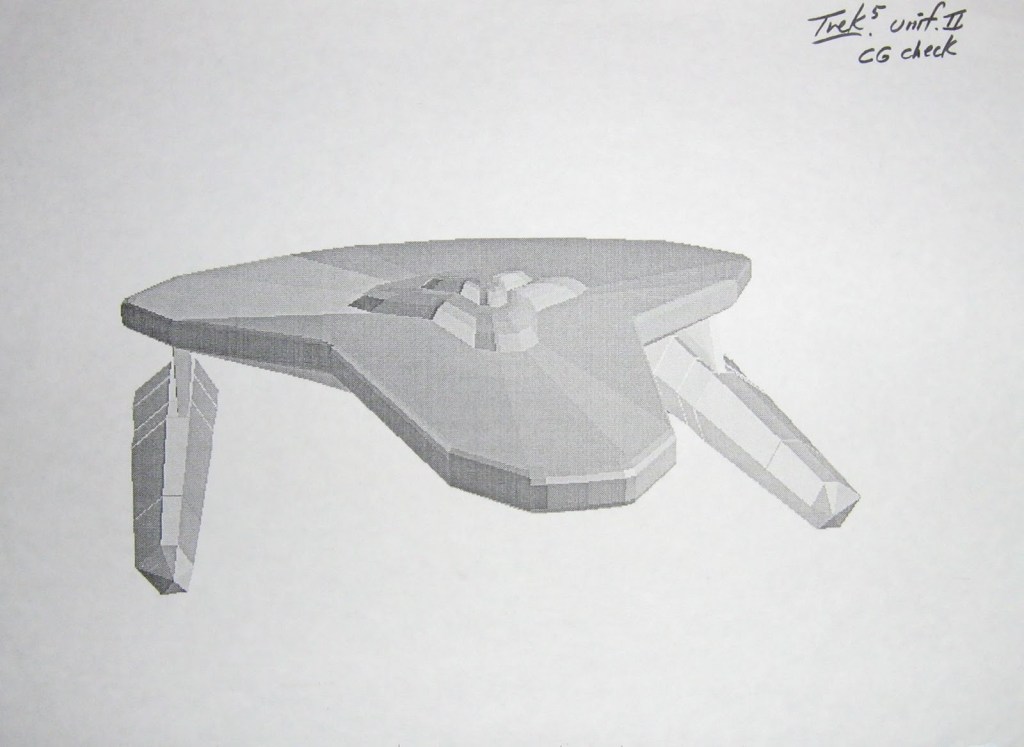 From these computer designs, it seems clear that Sternbach began by looking at the only other Vulcan ship ever seen in on-screen Star Trek: Andrew Probert’s Shuttlecraft from Star Trek: TMP. This design seems to be a fusion of the nacelles from that vessel with a Starfleet-style saucer section.