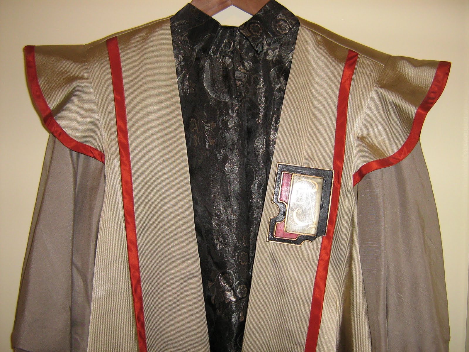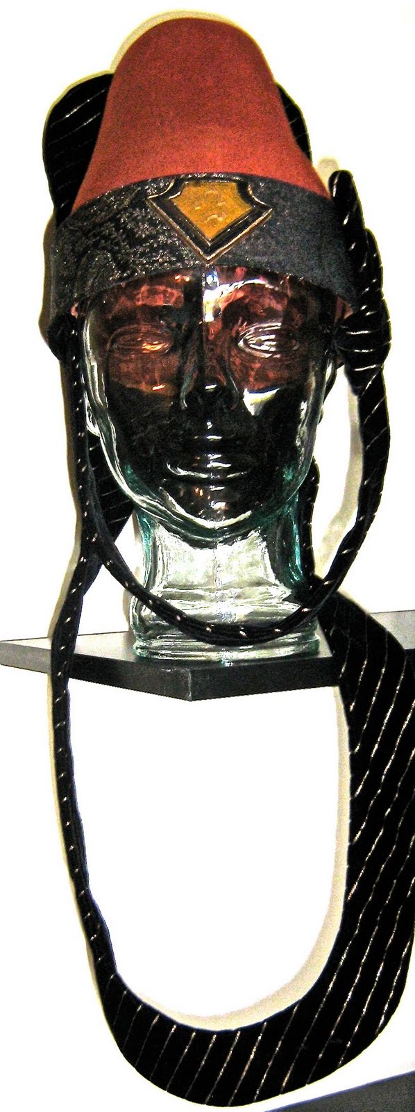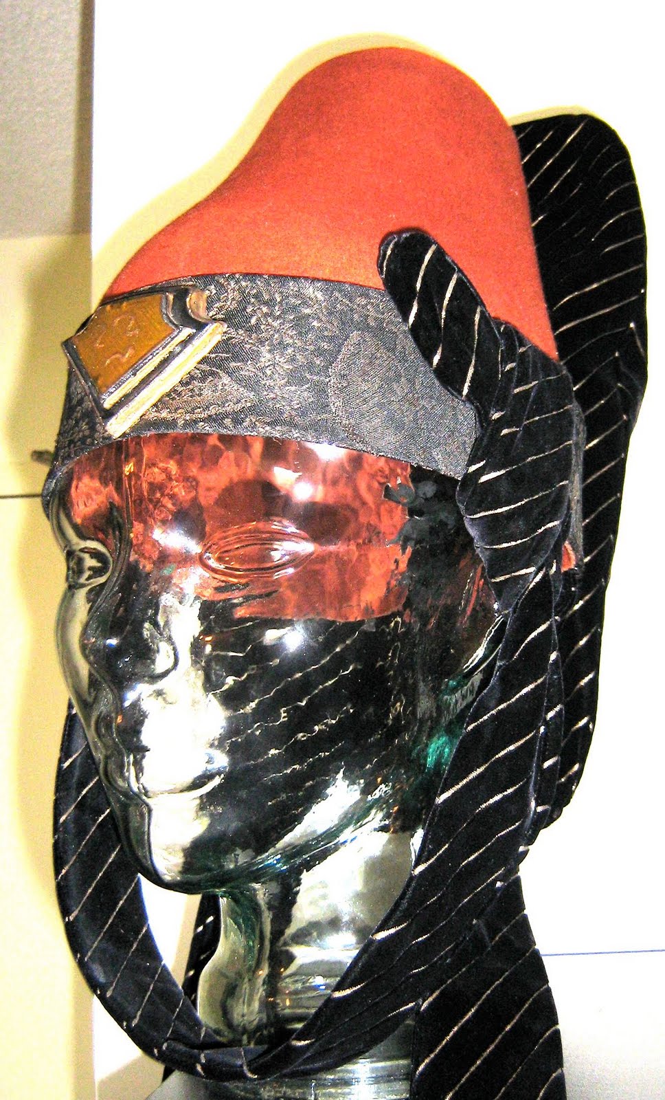 The costume features a tunic with metallic floral print fabric and massive, flowing bell sleeves. This fits under a “vest” with a cast resin “jewel.” The costume also includes a wonderful pair of pants. The pants and vest are marked with Paramount wardrobe tags “4-3.” The accompanying hat is marked “1-20” so it was probably not originally paired with the costume. However, the metallic floral pattern on the hat band is similar to that on the tunic.