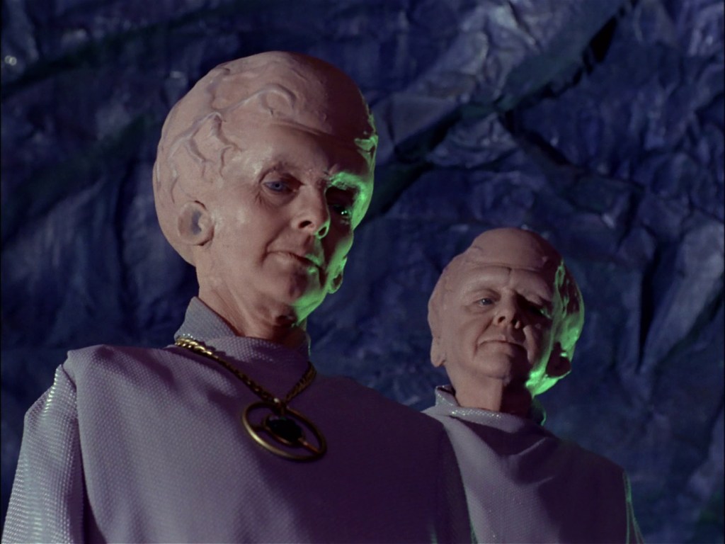 The make-up is great in this episode. Just figuring out Spock’s ears was an enormous challenge and they look terrific. I also love the Talosian design – they’re one of Trek’s most memorable aliens. The bladder system to get the veins on their heads to pulse is fun. The Kaylar (Mike Dugan) has some very questionable dentition.