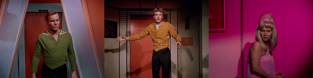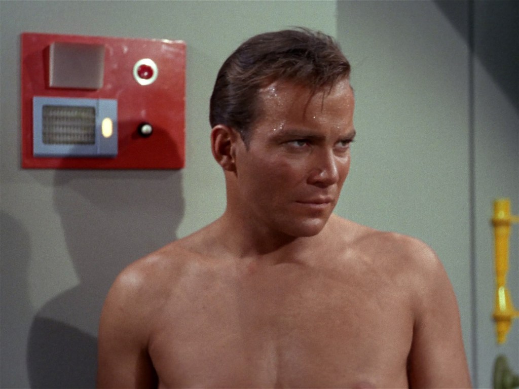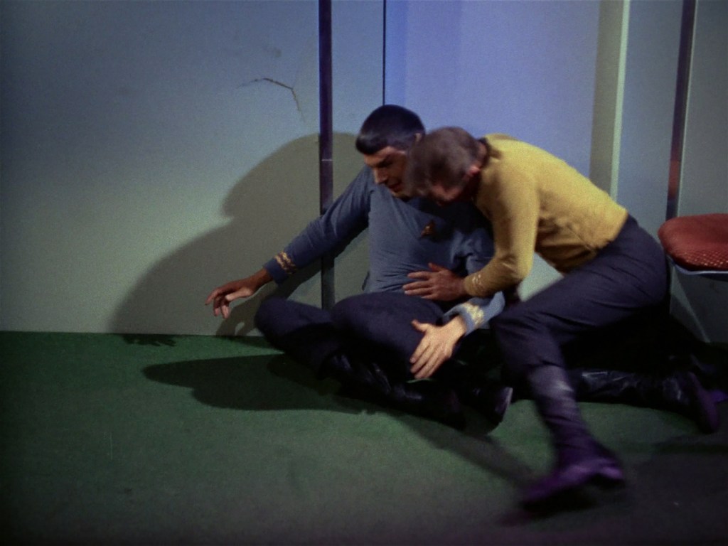 We see the first appearance here of Kirk’s green wraparound uniform tunic which looks great. We also see him in some spandex tights in the gym which are a bit less great.
