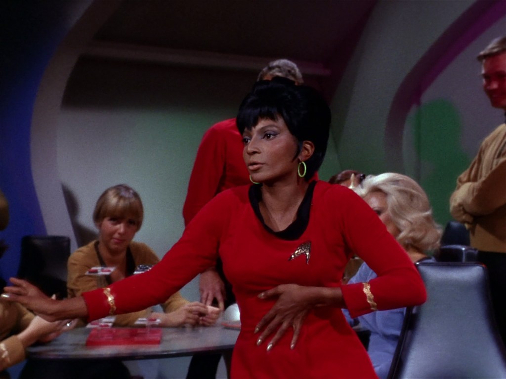 The other memorable costume in this episode is Rand’s pink nightgown. There is another woman crewmember wearing uniform pants in this episode. 5/5